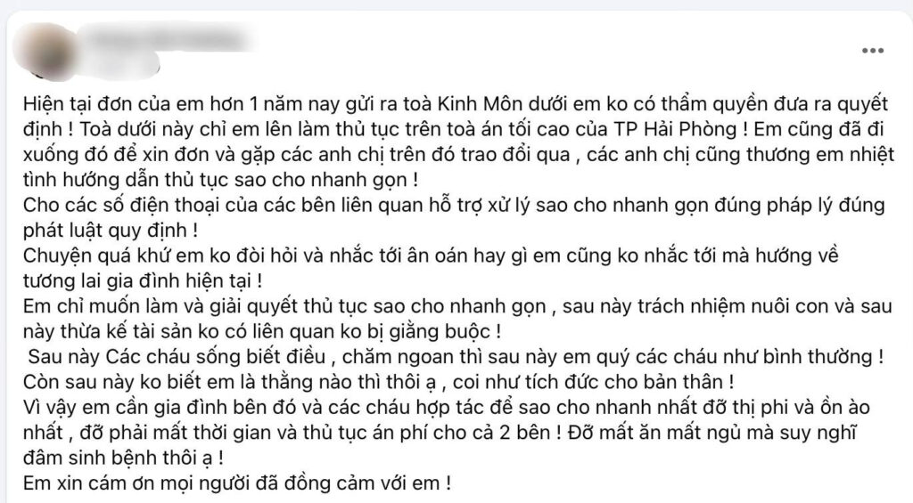 “Chuyện quá khứ em ko đòi hỏi và nhắc tới ân oán hay gì em cũng ko nhắc tới mà hướng về tương lai gia đình hiện tại. Em chỉ muốn làm và giải quyết thủ tục sao cho nhanh gọn , sau này trách nhiệm nuôi con và sau này thừa kế tài sản ko có liên quan ko bị ràng buộc