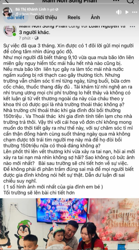Trên cương vị là một ngôi trường nuôi dạy trẻ mà lại xử xự như thế,lúc mới xảy ra sự việc thì ân cần, chăm sóc, hứa hẹn…đến giờ phút này thống nhất để giải quyết hậu quả để lại thì lại thái thác, quay ngược thái độ🥲. Ko chấp nhận vs hậu quả của sẹo và ảnh hưởng về thẩm mỹ mắt của cháu,mà ý nhà trường là chỉ hỗ trợ một ít về tinh thần cho cháu về sau.