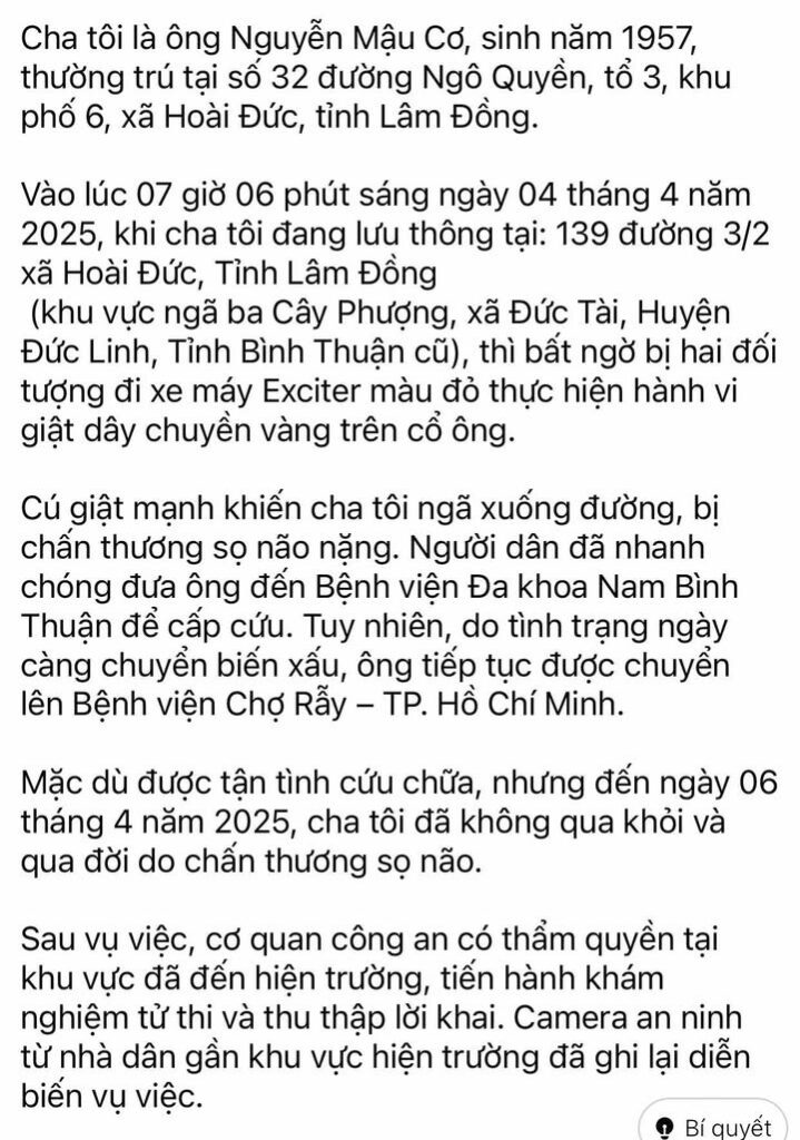 Lâm Đồng: 1 ng đàn ông b! cướp dây chuyền khi đang đi xe máy khiến ông ngã xuống đường và không qua khỏi sau đó